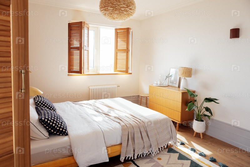 Солнечная уютная спальня с белыми стенами. Деревянная кровать и комод с бытовыми вещами. Мягкий пушистый ковер и горшечное комнатное растение