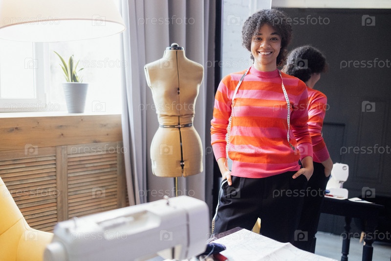 Молодая смеющаяся африканская женщина стоит рядом с манекенщиком. Улыбающаяся швея в повседневной одежде с ленточной мерой. Очаровательная черная девушка работает в домашней мастерской