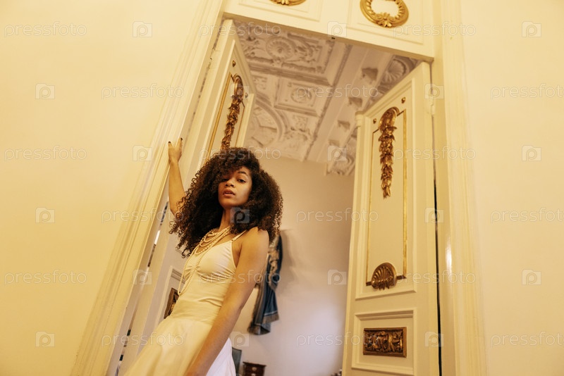 Молодой африканец в белом вечернем платье и украшениях выходит из украшенных дверей