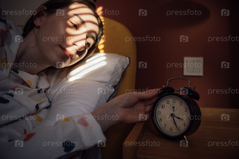 Девушка в милой пижаме просыпается утром и выключает будильник рядом с кроватью. Подросток готовится начать новый день в хорошем настроении