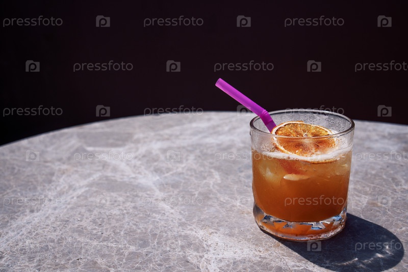 Завершение вкусного цитрусового коктейля в стакане на мраморном круглом столе. Чашка газированного напитка с соломой и ломтиком апельсина