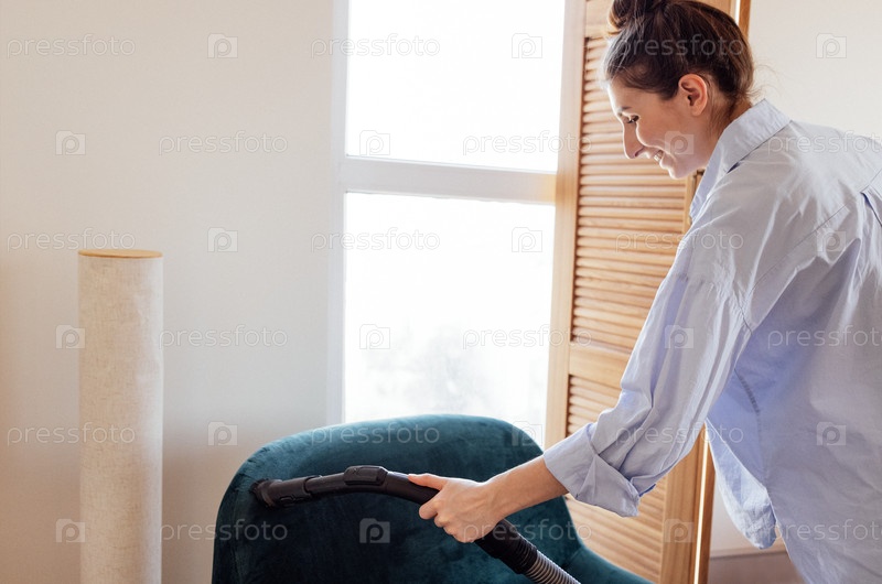 Улыбающаяся девушка в повседневной одежде пылесосит диван в гостиной дома. Подросток в рубашке убирает по дому