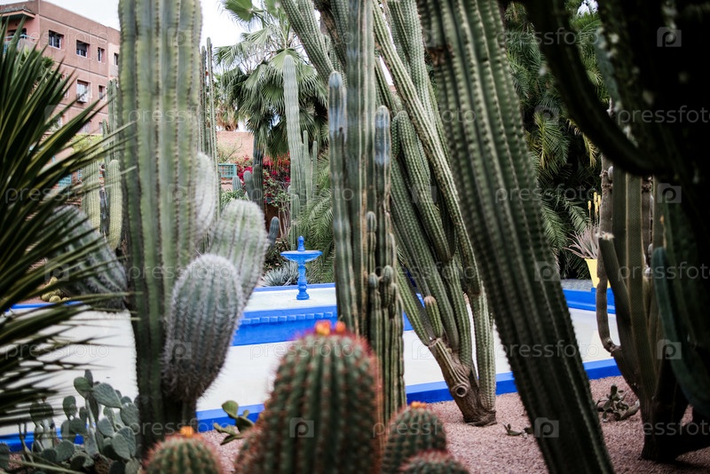 15 апреля 2025: Марракеш, Марокко. Вид на красочную стену особняка и горшечные растения в саду Майорель