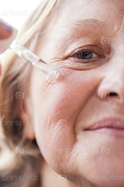 Пожилая женщина наносит увлажняющую сыворотку на лицо. Зрелая дама с глазорезом и антивозрастным гелем