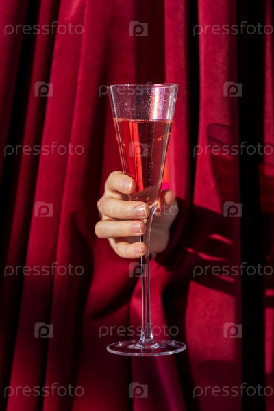 Элегантный бокал с розовым шампанским. Женская рука с кубком игристого вина. Женщина держит алкогольный напиток на фоне красных занавесок