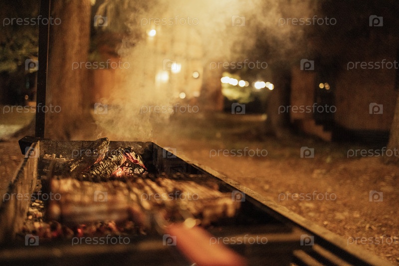 Закрытие вечернего барбекю во дворе дома. Вкусное сочное ароматное мясо на гриле и горящий уголь. Вкусная еда на открытом воздухе