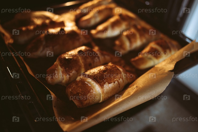 Закрытие вкусных аппетитных горячих круассанов на выпечке из духовки. Вкусная сладкая выпечка на пергаментной бумаге