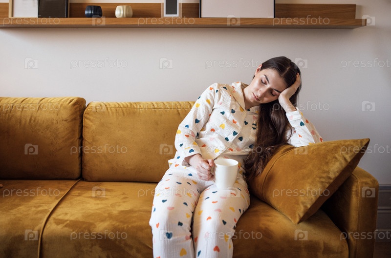 Замысел смешной девушки в милой печатной пижаме, сидящей на диване и зевающей