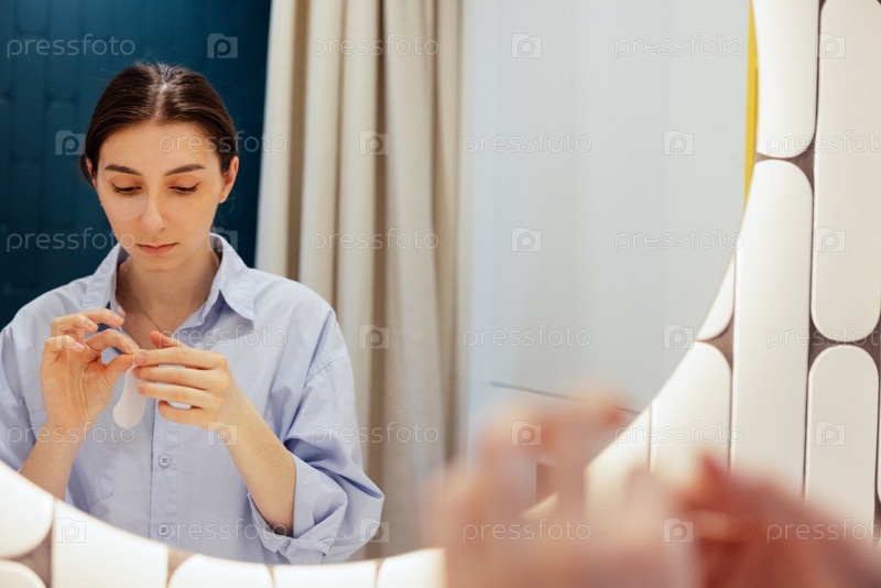 Молодая женщина наносит увлажняющие пластыри под глазами в ванной комнате. Отражение милой девушки, держащей в руках пятна в зеркале