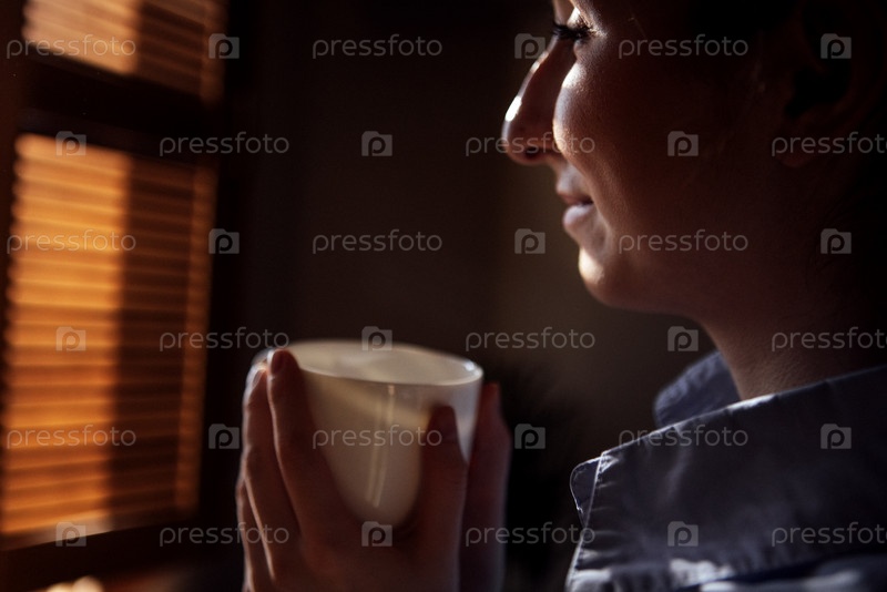 Закрытие молодой женщины в повседневной одежде, держащей чашку кофе и улыбающейся