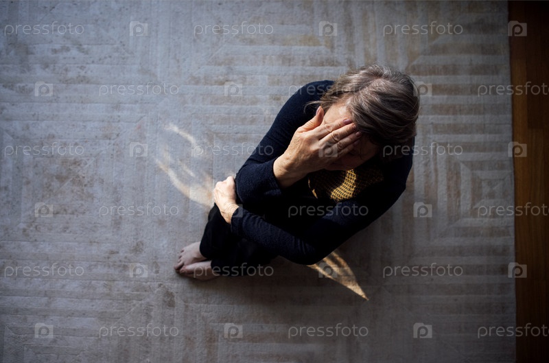 Пожилая женщина страдает от головной боли дома. Зрелая женщина сидит на полу и держит лоб рукой. Вид сверху