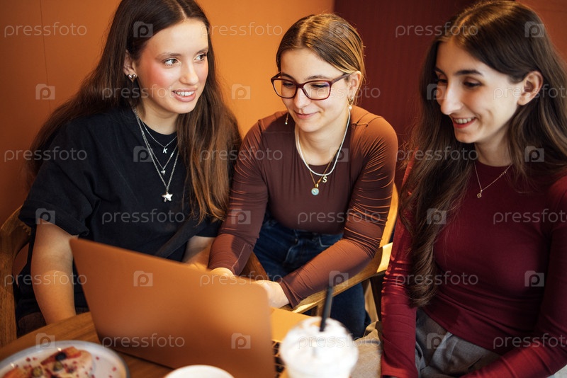 Трое подростков обсуждают идеи и работают на ноутбуке в кафе