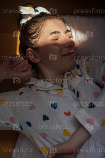 Девушка в милой пижаме просыпается и растягивается в постели дома. Подросток закрывается от солнечного света утром в спальне