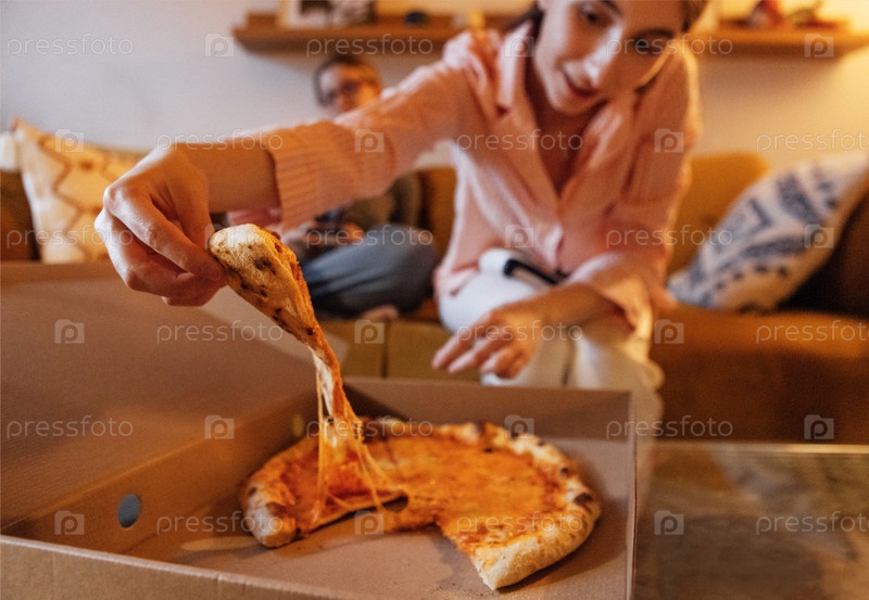 Пицца и девушка, берущая кусок из картонной коробки. Студент в пижаме ест фастфуд дома вечером