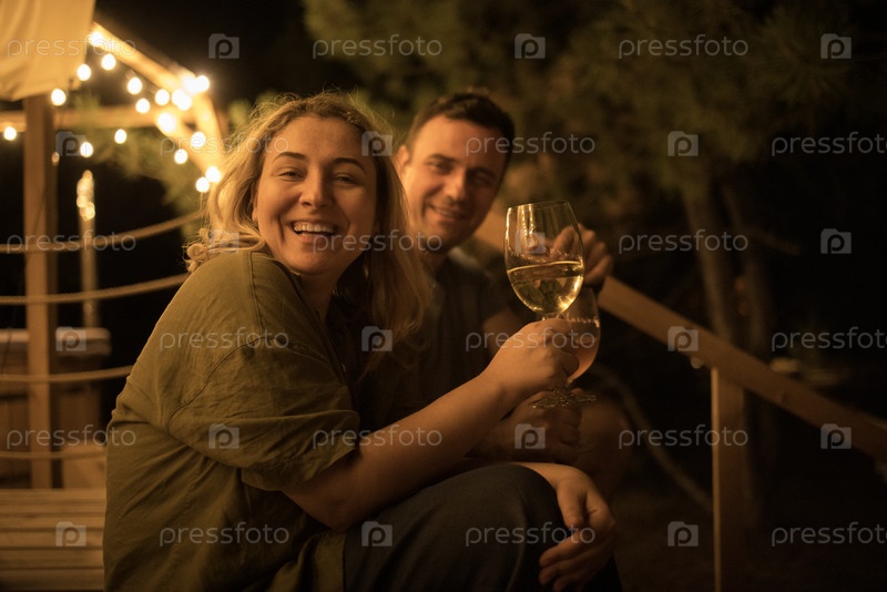 Молодая супружеская пара смеется и держит бокалы шампанского на веранде кафе. Друзья улыбаются и празднуют встречу на открытом воздухе