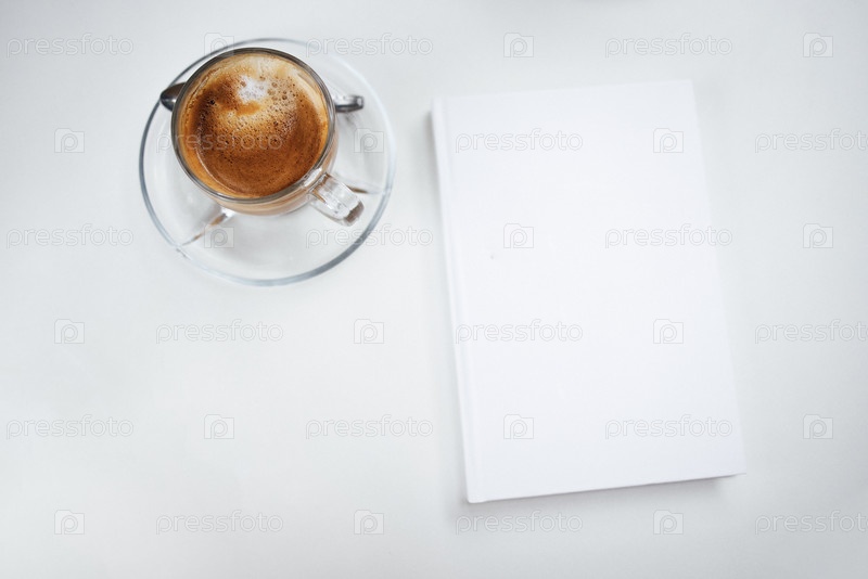 Уютная и минималистическая легкая сцена с чашкой кофе в паре с пустой книгой