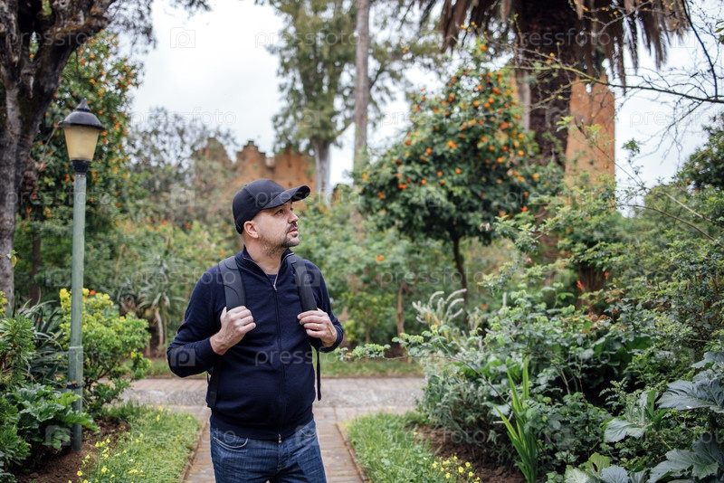 Турист в саду Аль-Касба на заднем плане, цитадель и площадь Ута-эль-Хамман, Шефшауэн