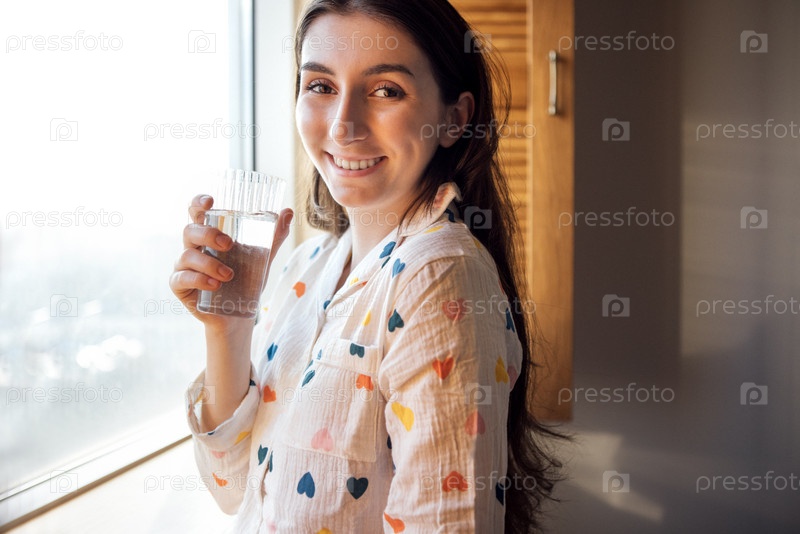 Очаровательная девушка в милой пижаме, стоящая у окна и пьющая воду. Молодая студентка проснулась и держит стакан воды в своей спальне дома