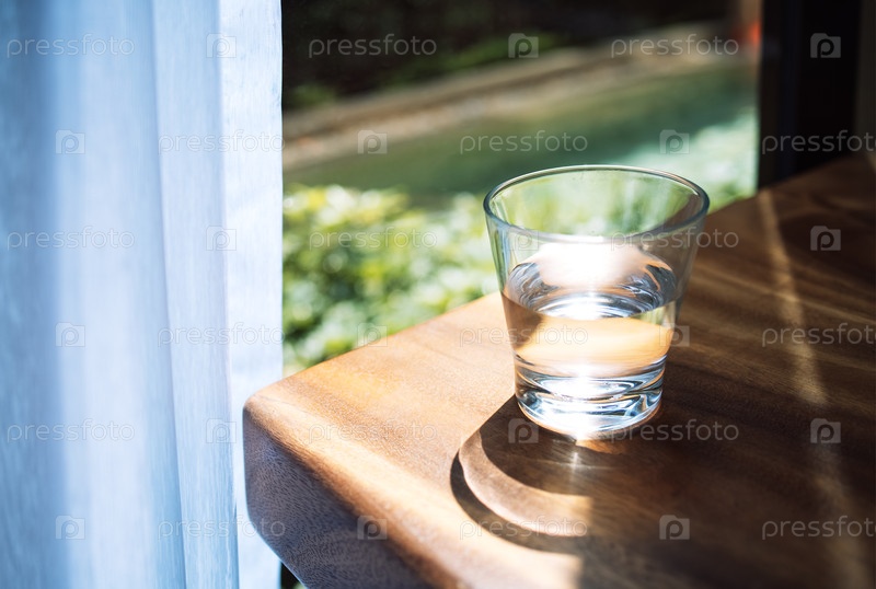 Закрытие стакана чистой воды на деревянном столе