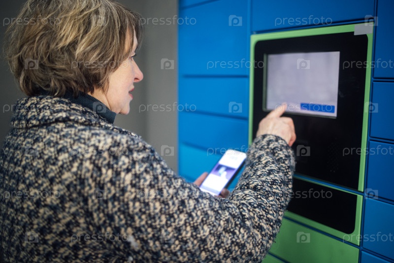 Пожилая женщина в пальто нажимает на дисплей, чтобы получить посылку. Зрелая женщина вводит данные в автомат посылки. Пенсионер держит телефон и набирает код для получения покупки
