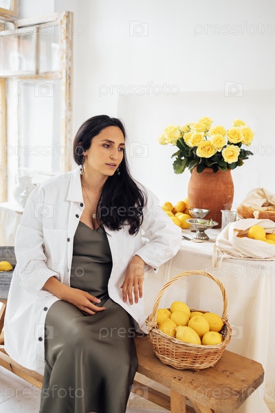 Молодая женщина улыбается и садится за стол с лимонами. Глиняный кувшин с желтыми розами