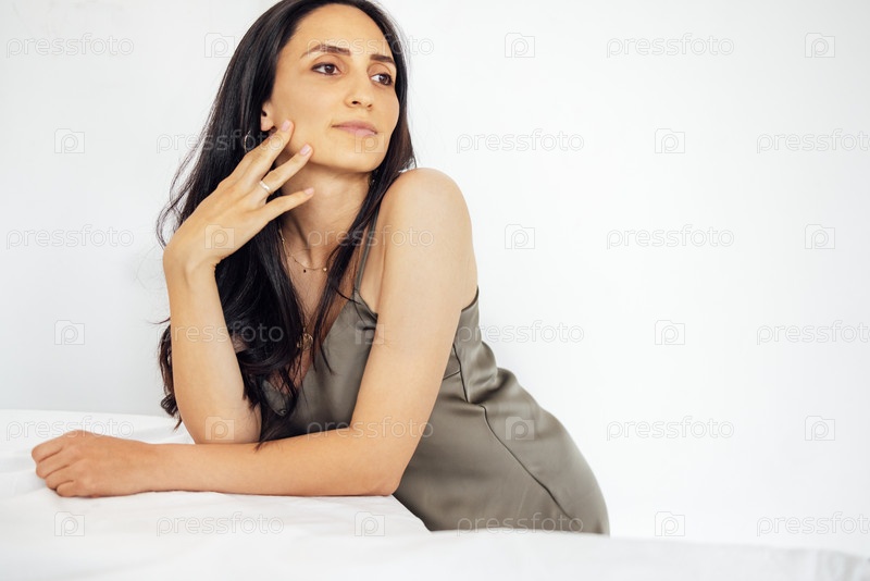Портрет привлекательной молодой женщины в зеленом атласном платье