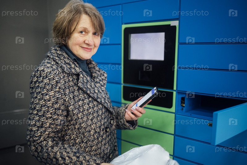 Пожилая женщина нажимает на дисплей, чтобы получить посылку. Зрелая женщина в повседневной одежде