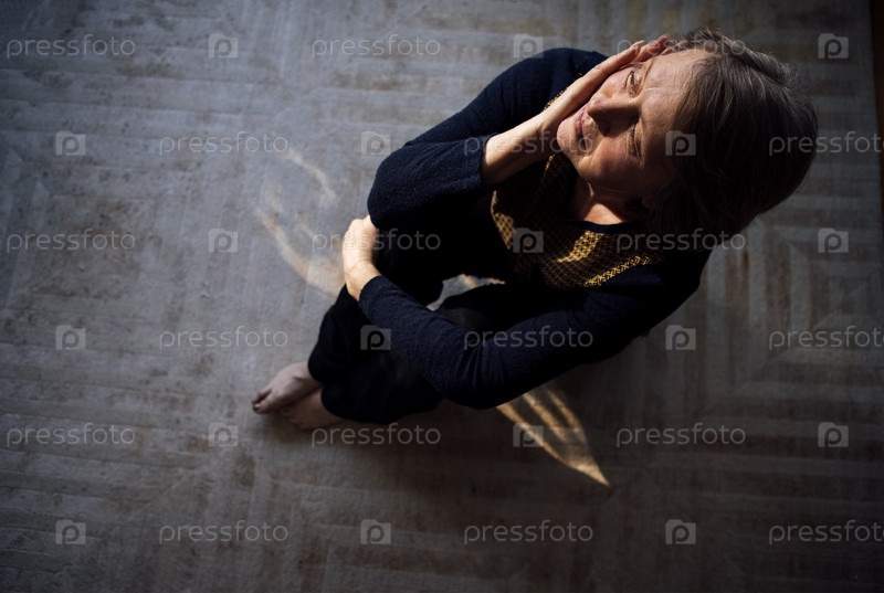 Пожилая женщина страдает от головной боли дома. Зрелая женщина сидит на полу