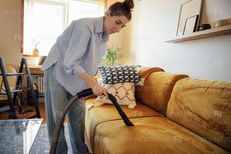 Молодая женщина, держащая в руках всасывающую щетку, пылесосящую обивку дивана