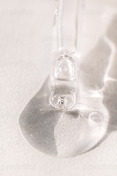 Закрытие стеклянной пипетки каплей увлажняющей сыворотки с пузырьками. Косметические продукты. Витаминная эссенция с капельницей на светлом фоне. Минимализм