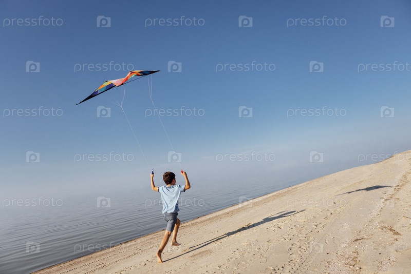Маленький мальчик летает на змее на берегу моря. Ребенок бежит по песчаному пляжу и веселится на открытом воздухе. Ребенок играет у океана на летних каникулах