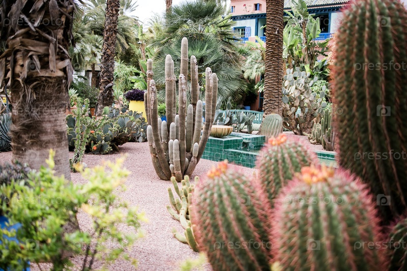 15 апреля 2025: Марракеш, Марокко. Вид на красочную стену особняка и горшечные растения в саду Майорель