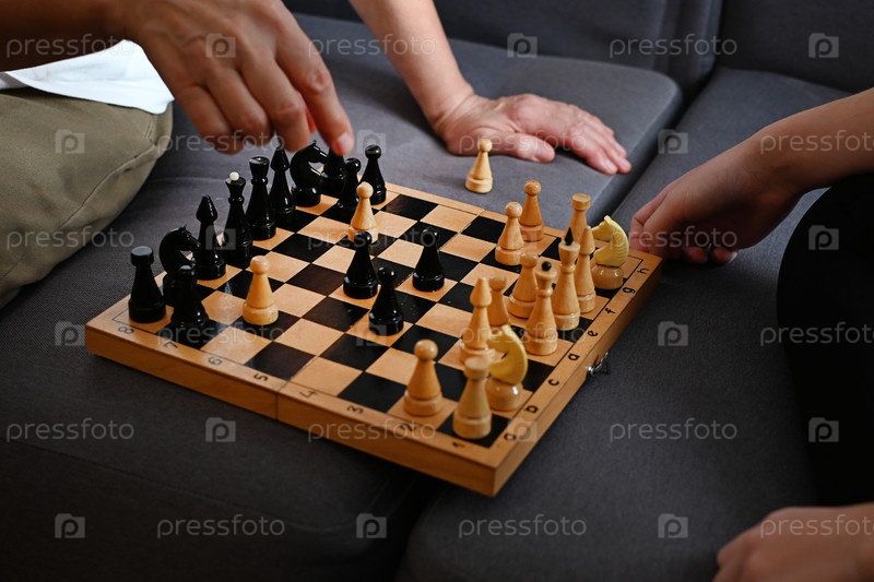 Бабушка и внучка-подросток с энтузиазмом играют в шахматы на уютном диване, демонстрируя стратегию и концентрацию в уютной обстановке гостиной