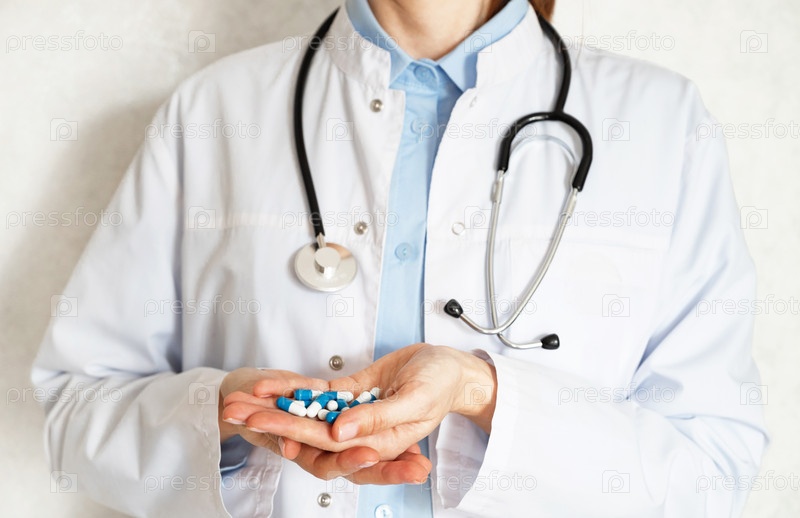 Врач держит различные таблетки и капсулы во время ношения стетоскопа
