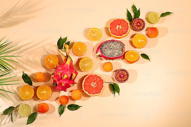 Лето в снимке, апельсины, драконьи фрукты, абрикосы, питайя, грейпфрут на ярком фоне с тенями от пальмы, тропический фон с экзотическими фруктами, шаблон для вашего дизайна