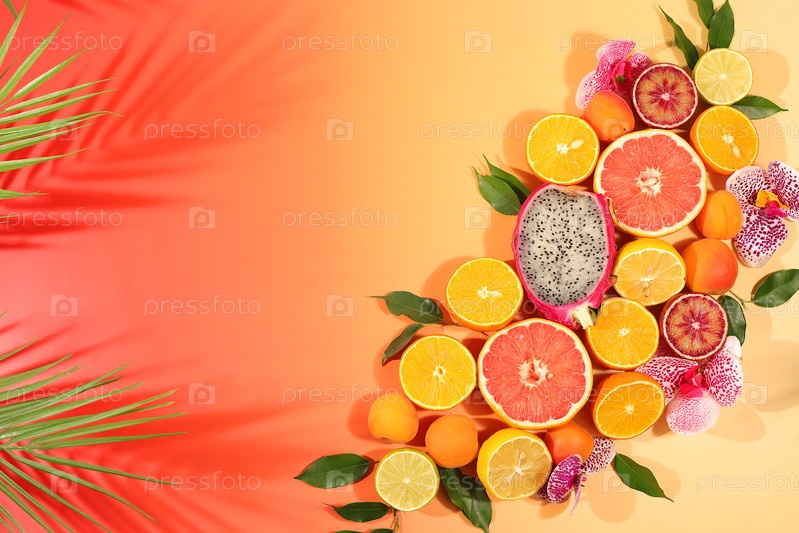 Плодовитое солнечное знамя. Лето в снимке, апельсины, драконьи фрукты, абрикосы, питайя, грейпфрут на ярком фоне с тенями от пальмы, тропический фон с экзотическими фруктами, шаблон для вашего дизайна