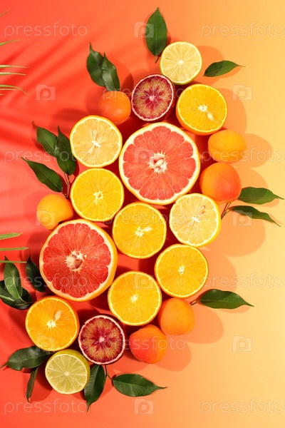 Лето в снимке, апельсины, абрикосы, лимоны, грейпфрут на ярком фоне с тенями от пальмы, тропический фон с экзотическими фруктами, фруктовый солнечный баннер. Шаблон для вашего дизайна