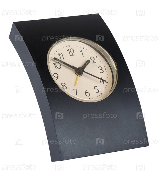 Черные настольные часы с белым циферблатом, изолированные (элемент дизайна)