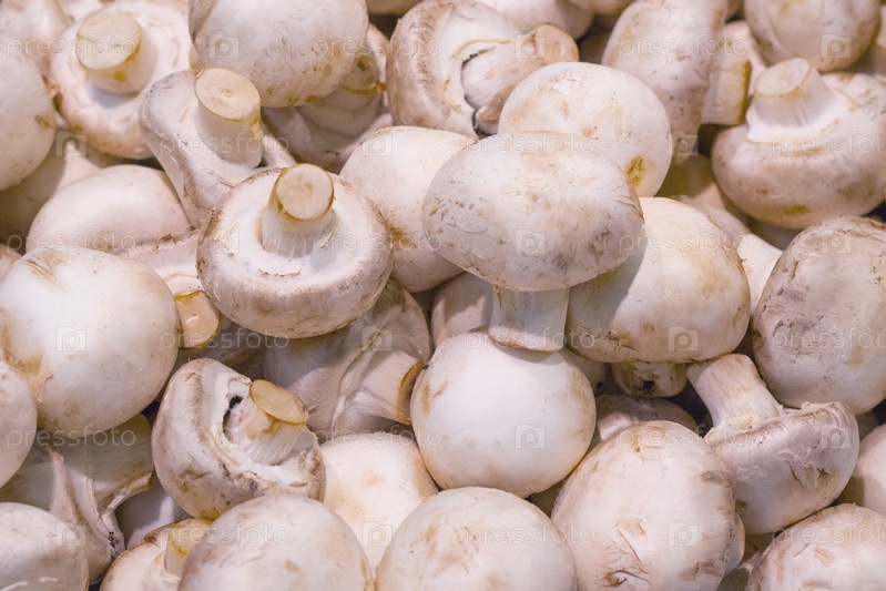 Шампиньон грибы на прилавке в супермаркете (фон, текстура)