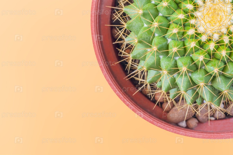 Фрагмент кактуса расположен в углу изображения на оранжевом фоне с копировальным пространством (плоская кладка)