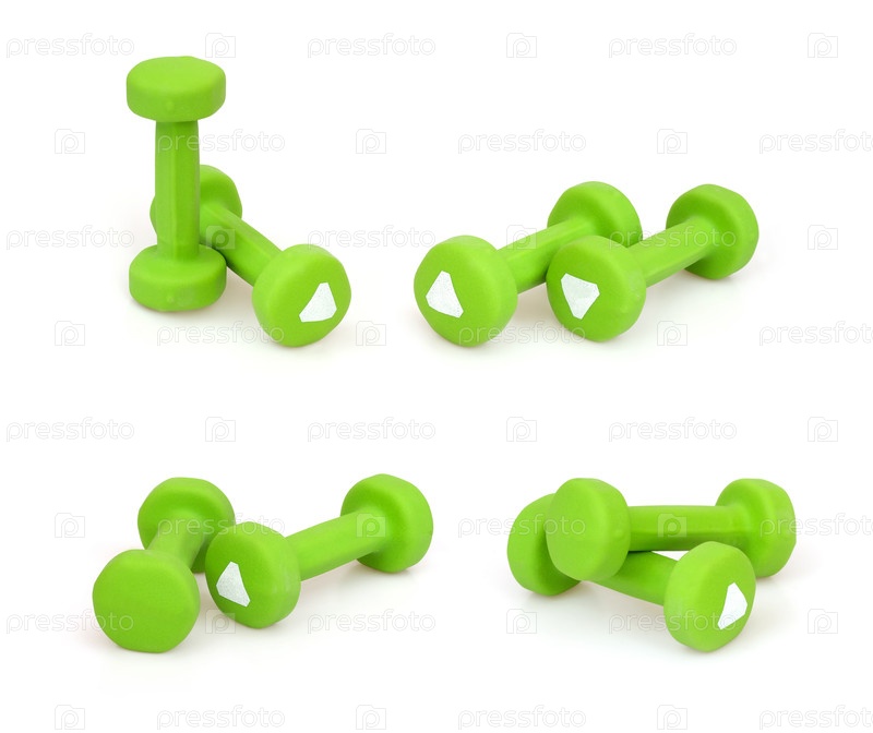Зеленые гантели для спортивных мероприятий изолированы на белом фоне