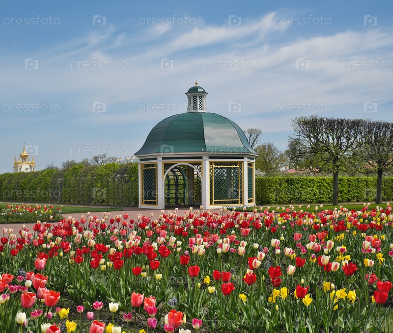 Петродворец (Петергоф, Санкт-Петербург, Россия). Весенний вид на Верхний парк. Треллис беседки (берсо, перголы), дворцовая церковь и тюльпаны