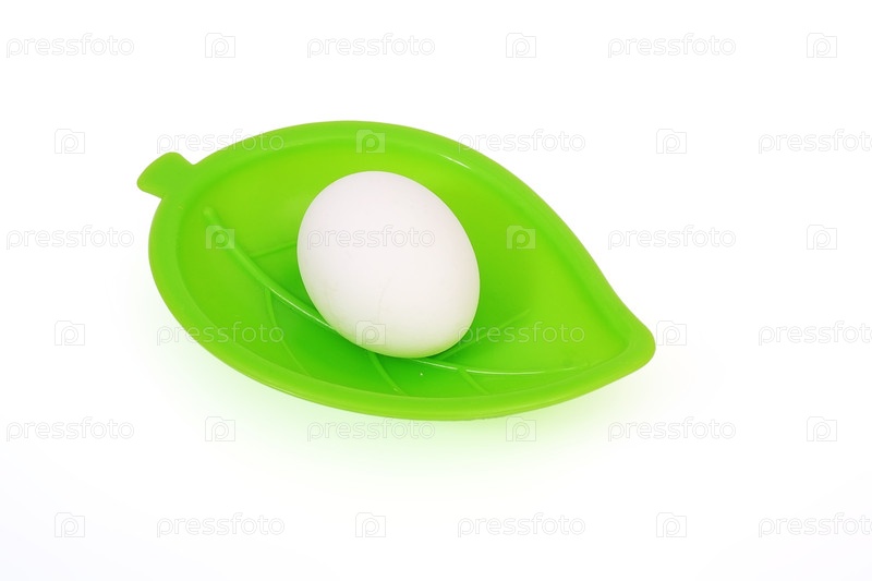 Вареное яйцо на зеленой блюдце в виде листа, выделенного на белом фоне