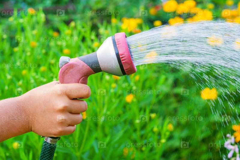 Закройте вид на руку с разбрызгивателем, который поливает желтые цветы в саду (небольшая глубина резкости)