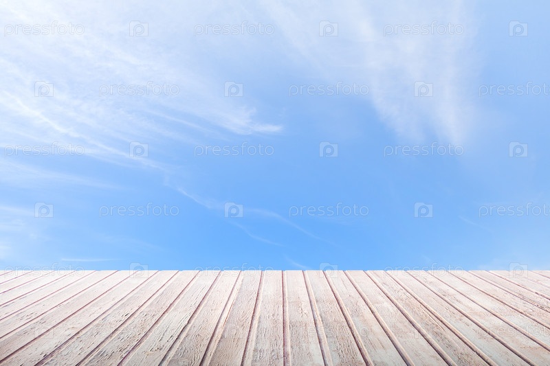 Перспективный вид на деревянную столешницу на ярко-синем фоне неба