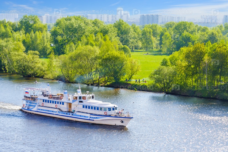 Вид с воздуха на круизный лайнер на реке на фоне зеленых деревьев на побережье