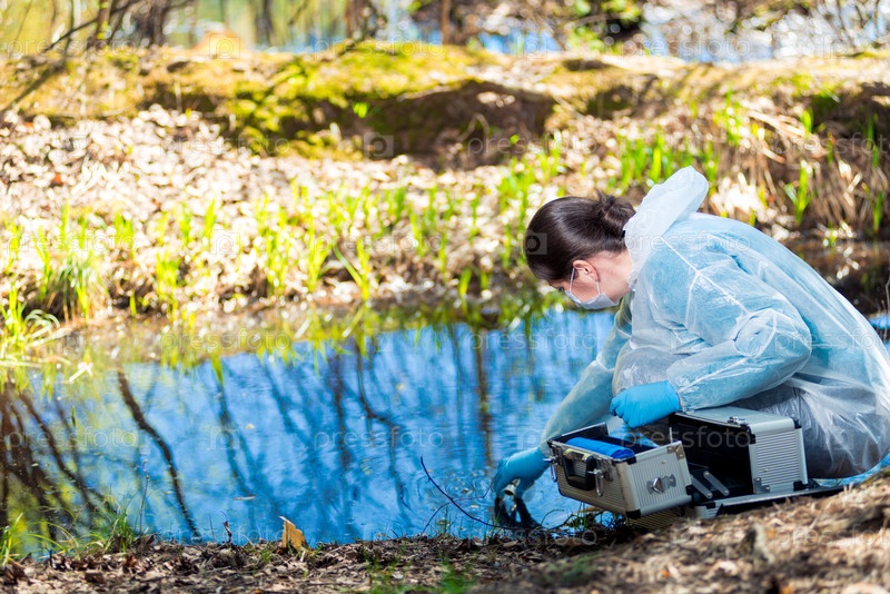 Химик проводит исследование воды из природного источника в лесу, выявляя эпидемию