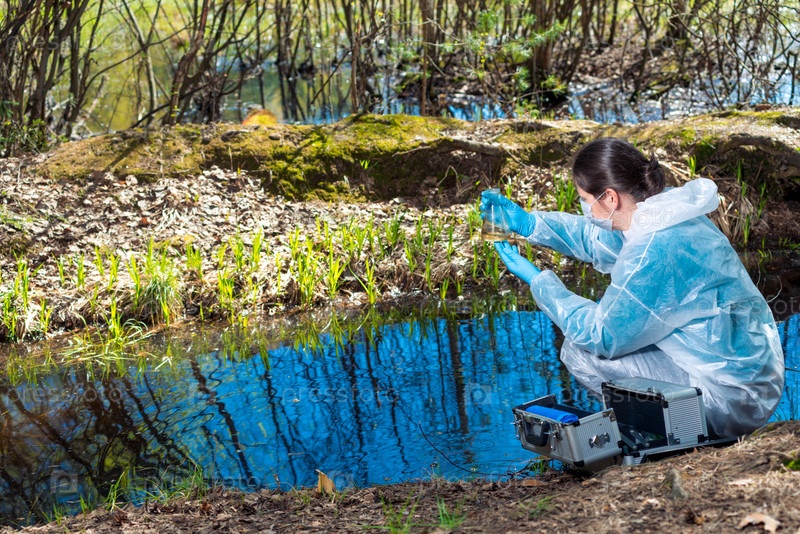 Экологическая катастрофа, химик-эколог исследует воду в лесной реке