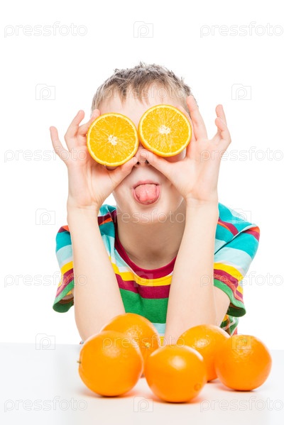 Юмористическая фотография мальчика с апельсинами на белом фоне в студии