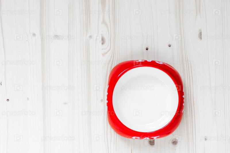 Пустая чаша с кошачьим кормом на полу вид сверху крупным планом, пространство слева